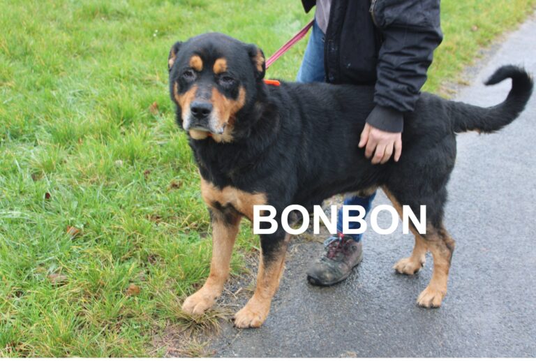 Vagabond dit Bonbon est un croisé beauceron, c’est un gros nounours très gentil et câlin il est ok avec les chats, avec ses congénères…